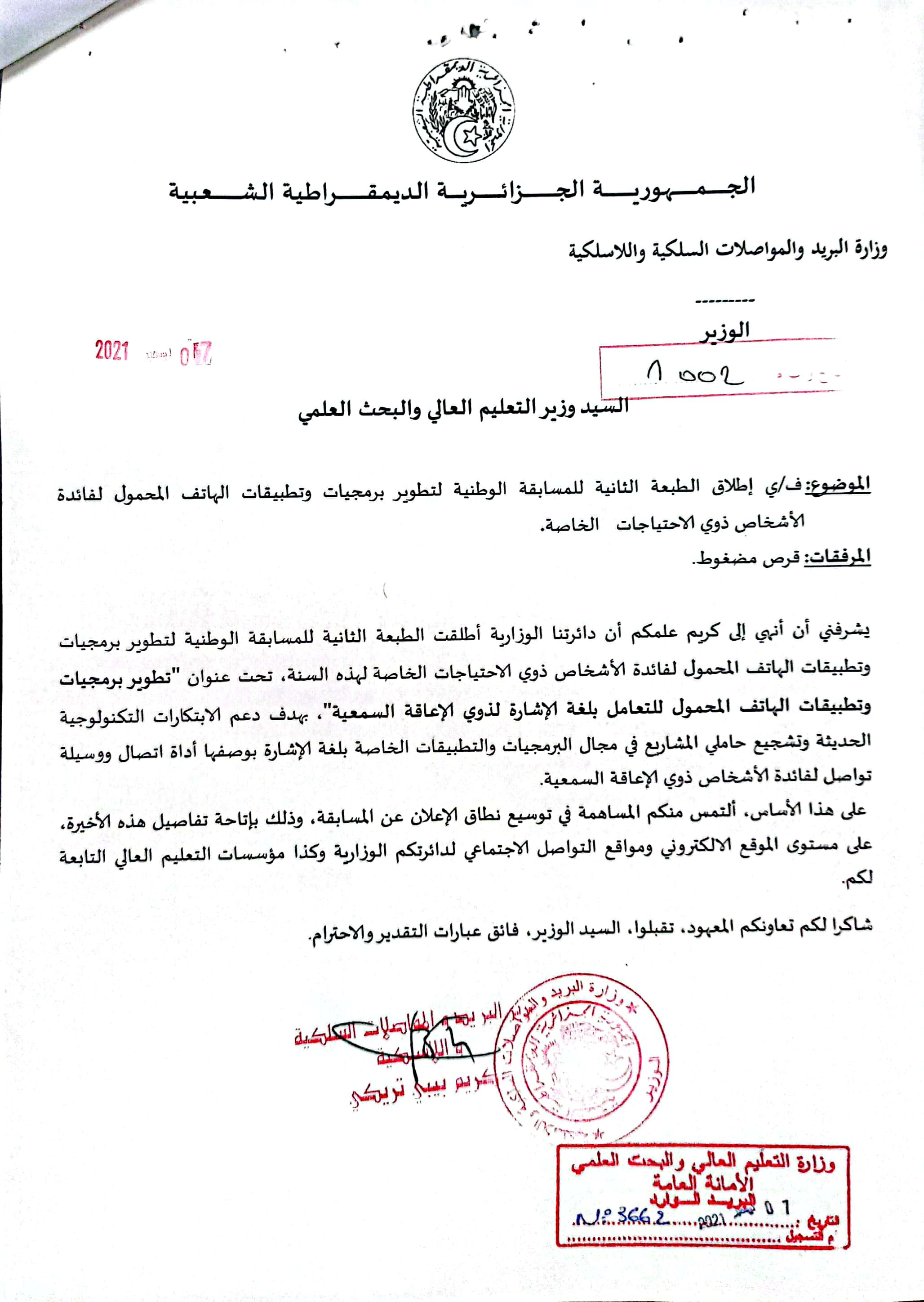 تعلن وزارة البريد و المواصلات السلكية واللاسلكية عن إطلاق الطبعة الثانية من المسابقة الوطنية لتطوير برمجيات وتطبيقات الهاتف المحمول لفائدة الأشخاص ذوي الاحتياجات الخاصة لسنة 2022 تحت عنوان "تطوير برمجيات و تطبيقات الهاتف المحمول للتعامل بلغة الإشارة لذوي الإعاقة السمعية".