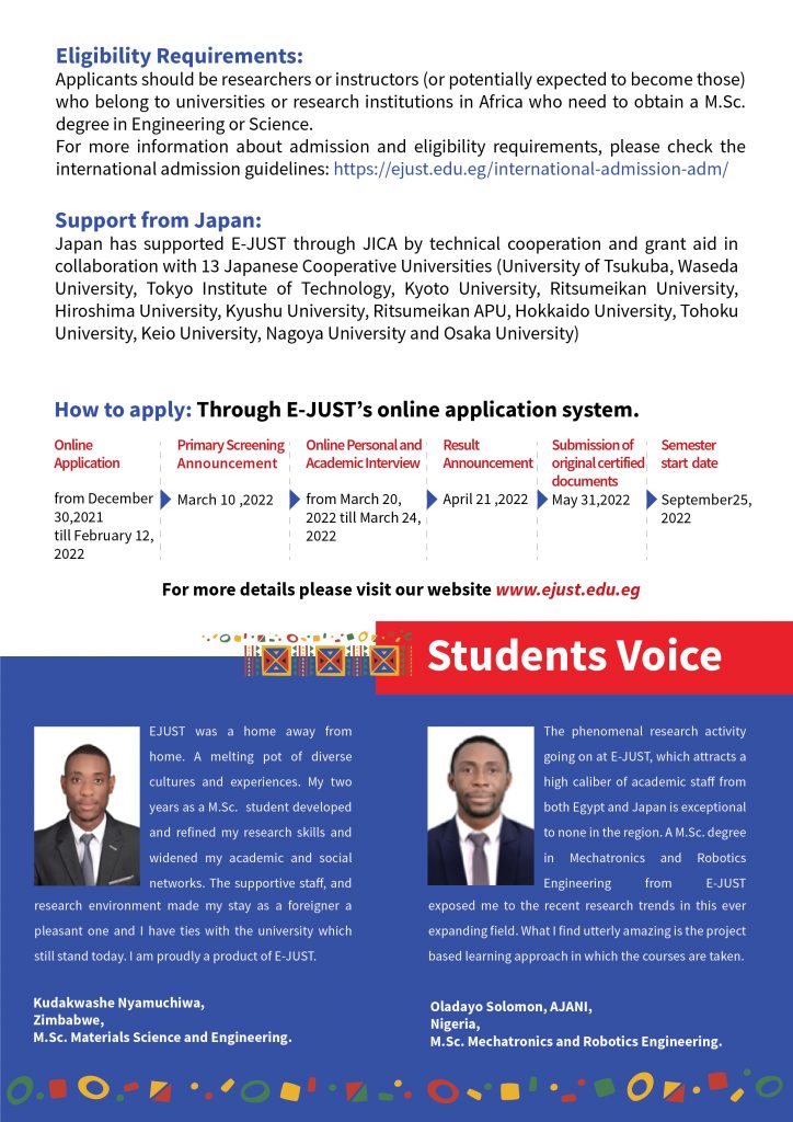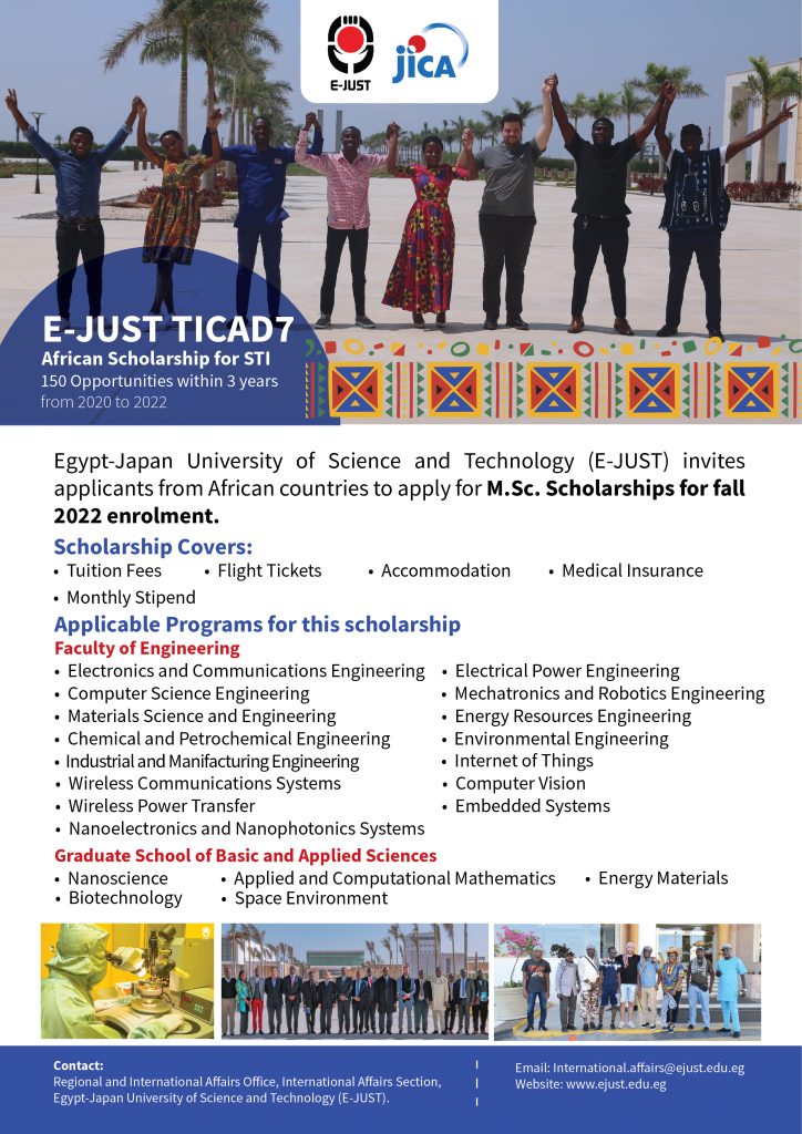 توفـر الجامعة المصرية اليابانية 150 منحة مخصصة لطلاب الدراسات العليا بالبلدان الإفريقية على مدار 03 سنوات و تشمل مصاريف الدلراسة و تذاكر الطيران بالإضافة إلى تأمين صحي و راتب شهري... تحميل المراسلة