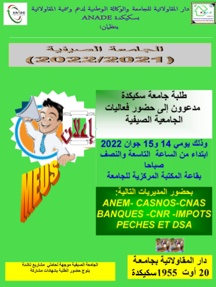 تنظم دار المقاولاتية بالتعاون مع الوكالة الوطنبة لدعم وتنمية المقاولاتية سكيكدة  الجامعة الصيفية حول الفكر المقاولاتي وكيفيات  إنشاء مؤسسة ناشئة.  البرنامج