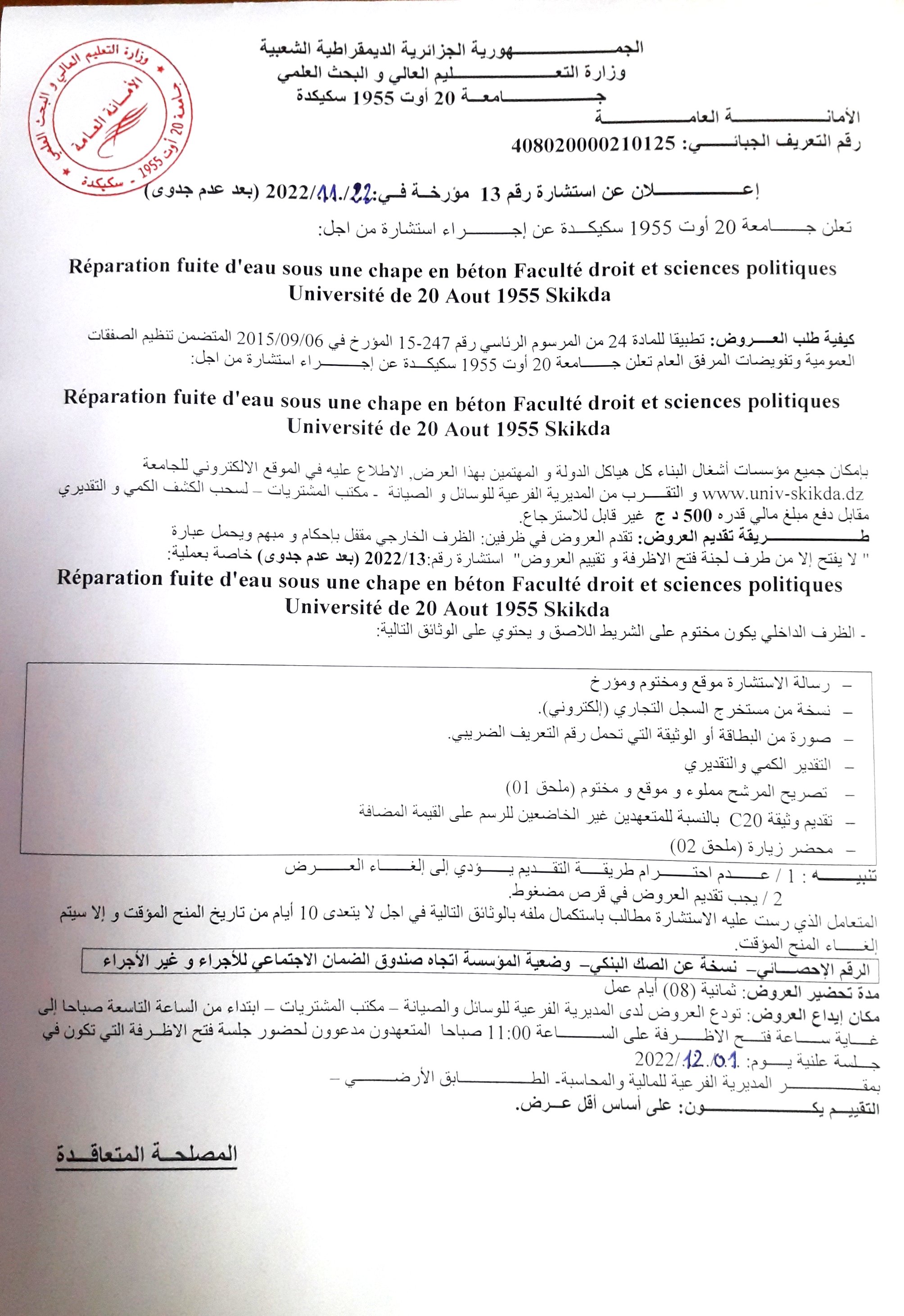 تعلن جـــــــامعة 20 أوت 1955 سكيكـــدة عن إجراء استشارة  رقم 13 مؤرخة في  2022/11/21 - بعد عدم جدوى خاصة بـ: